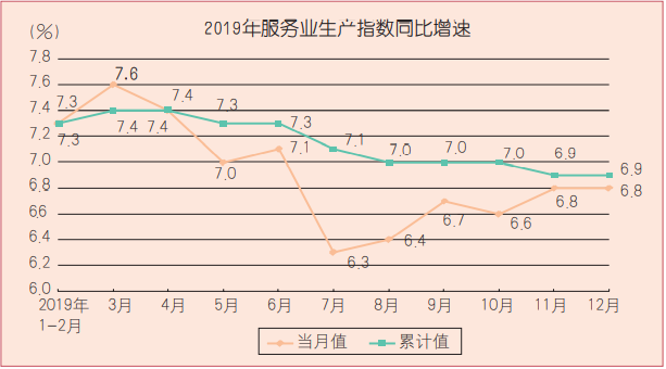 从 2019 年服务业生产指数看,全年服务业生产总体平稳,运行保持在合理区间。2019 年服务业生产指数累计同比增长 6.9%,服务业生产指数当月同比增长均不低于 6.3%,保持了较快增长态势。